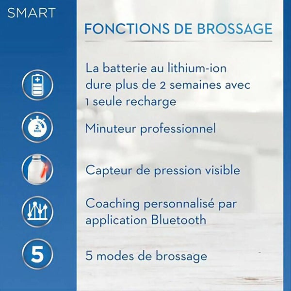 o La Smart 5 5000 offre de meilleurs résultats de brossage grâce aux conseils en temps réel avec la connectivité Bluetooth et l’application Oral-B.