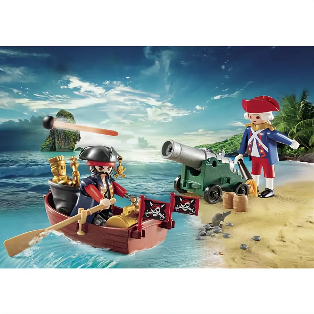 Le pirate tente de s'échapper avec son butin, le soldat de la garde royale arrivera-t-il à l'arrêter avec son canon ?