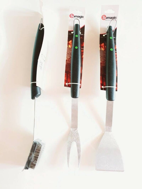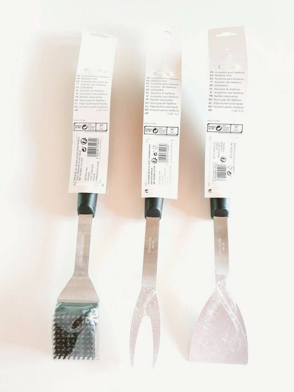 Set de 3 accessoires en acier inoxydable avec manche 44 cm pour cuisson au barbecue et à la plancha.