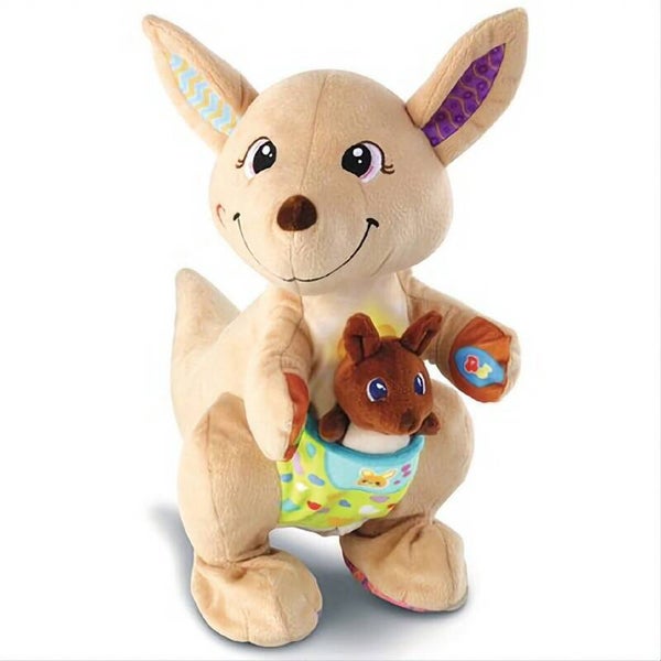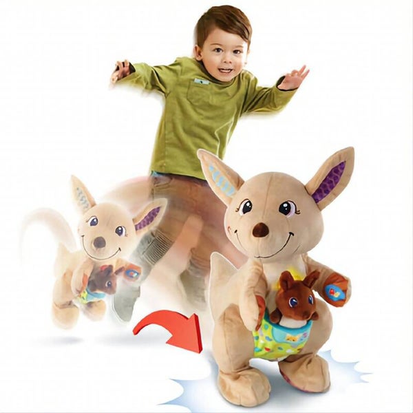 Une adorable famille kangourou qui sautille et stimule bébé dans ses premières découvertes ! Maman Kangou-love et son bébé. Deux peluches toutes douces : Maman Kangourou et son petit bien installé dans sa poche se déplacent en sautillant. Si le bébé kangourou n'est plus dans la poche de sa maman, il se met à pleurer et sa maman sautille pour le retrouver. Différents modes de jeu : Bouton Chansons & mélodies pour entendre maman kangourou et son petit chanter en duo. Bouton Découvertes pour apprendre des anecdotes sur les kangourous.