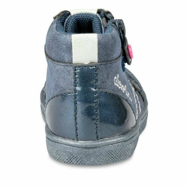 Elle nous propose cette superbe basket bleu marine, magnifiée par des empiècements pailletés et des lacets bicolores.