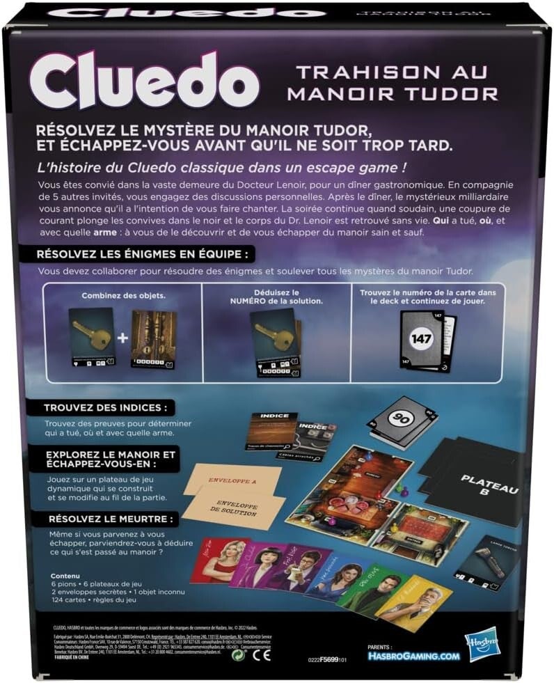 - UN JEU DE MYSTÈRE FAÇON ESCAPE GAME : Le jeu de plateau Cluedo Trahison au Manoir Tudor allie le suspense et l'intrigue du Cluedo, aux énigmes classiques, à un jeu de plateau de type Escape Game. Pour 1 à 6 joueurs, à partir de 10 ans