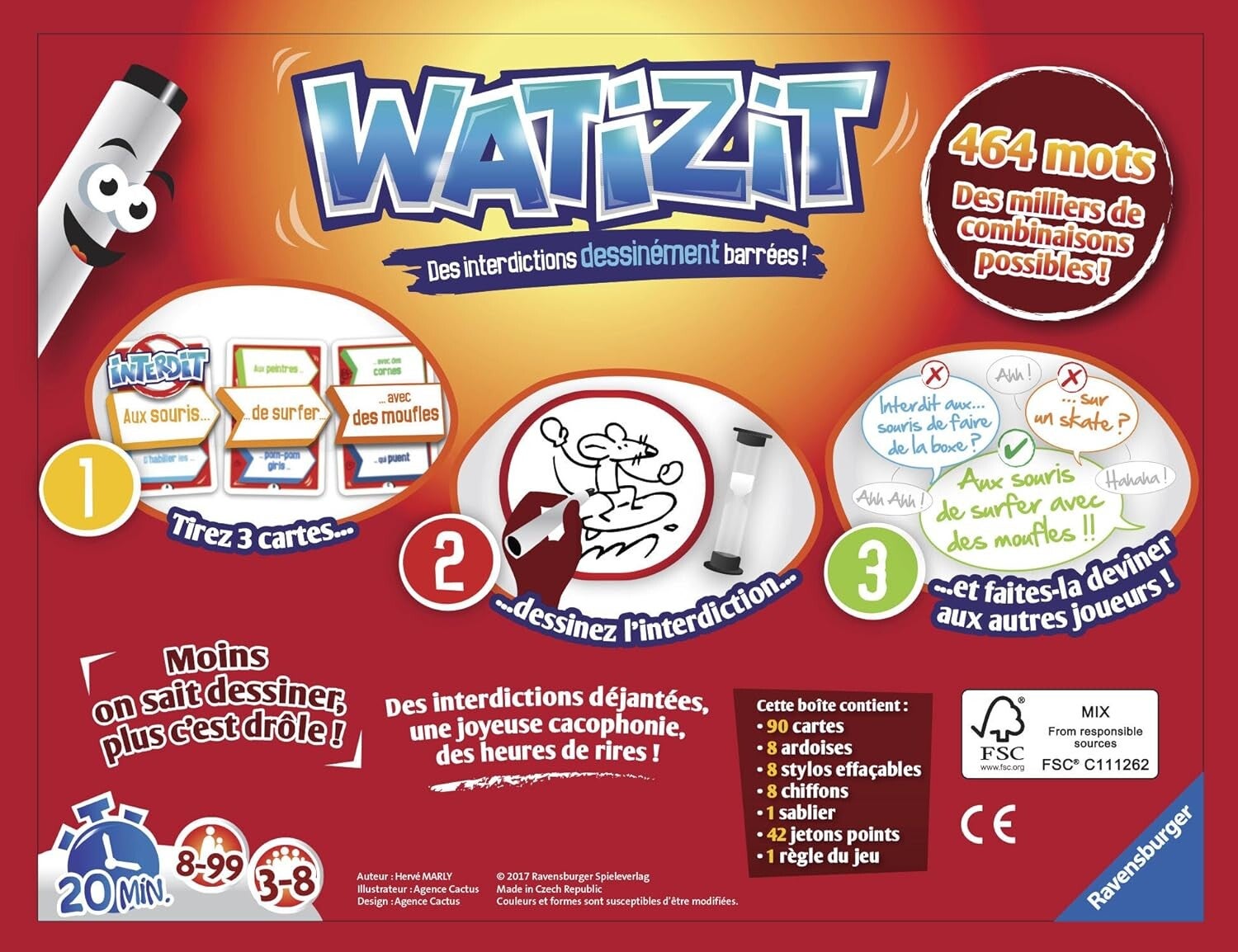 - Contenu du packaging: 90 cartes, 8 ardoises pliables, 8 stylos effaçables, 8 chiffons, 1 sablier, 42 jetons points, 1 règle du jeu