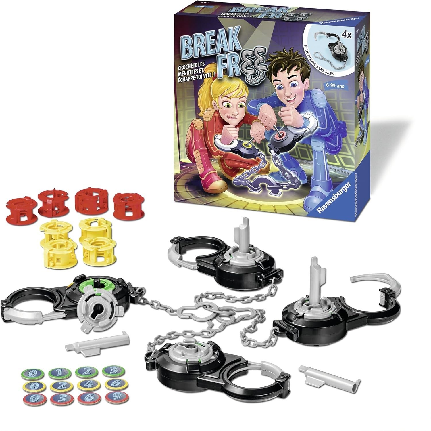 - Contenu du packaging: 4 menottes, 4 crochets, 16 cylindres de serrures, 16 jetons, une règle de jeu