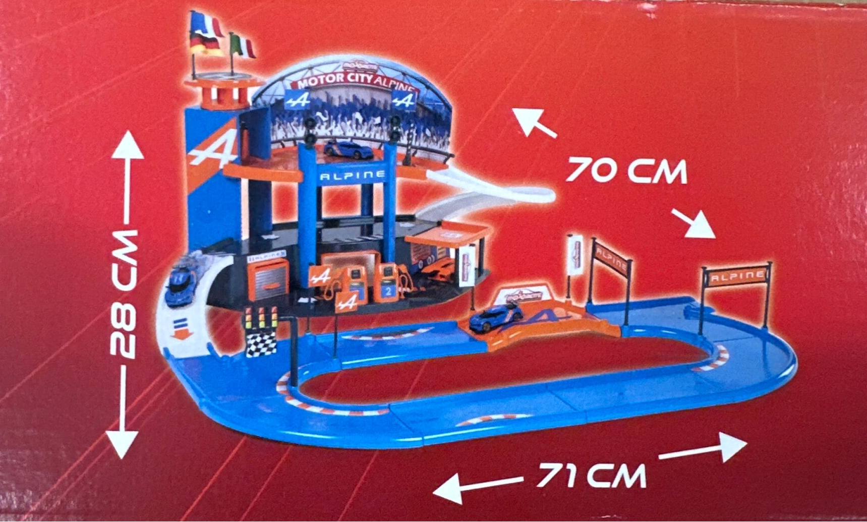 Garage Majorette à la gloire de la mythique marque de voitures de sport et de compétition française Alpine, avec plusieurs fonctions : pompe a essence, atelier mécanique, ascenseur, garage a voitures... + de 1,60m de piste !